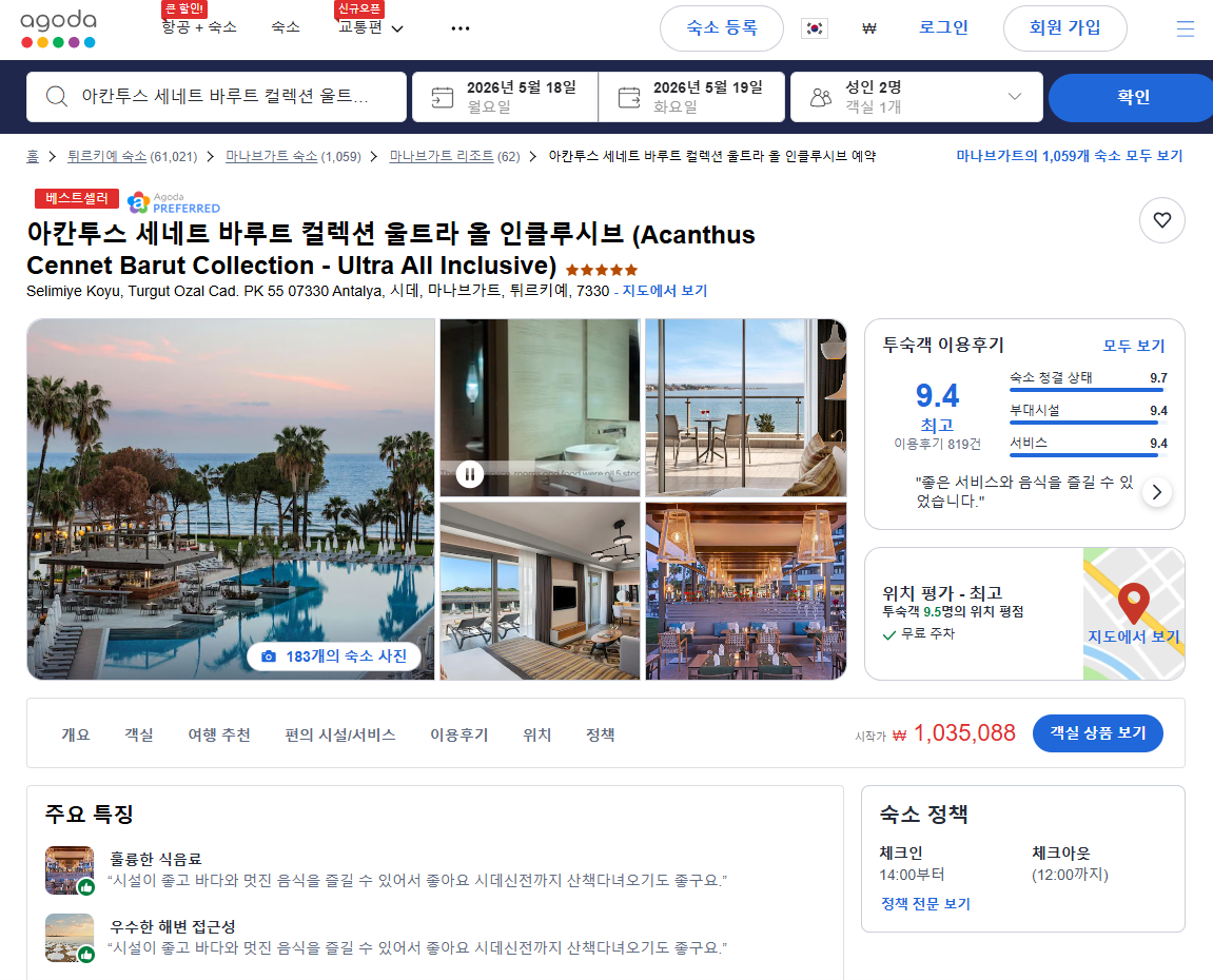 튀르키예 시데(side) 아칸투스 세네트 바루트 컬렉션 울트라 올 인클루시브 (Acanthus Cennet Barut Collection - Ultra All Inclusive) 호텔의 1박당 요금 최저 가격대(세금 및 봉사료 포함)는 아고다웹사이트에서 할인특가 가격으로 매일매일 변동되며 객실에 따라 10만원대부터 다양하게 형성됩니다. 날짜별로 매일 가격이 다르므로 아고다웹사이트 최저가를 확인하시려면 아래 링크를 누르시고 원하는 날짜의 가격대를 선택해야 정확한 가격을 자세히 보실 수 있습니다.
