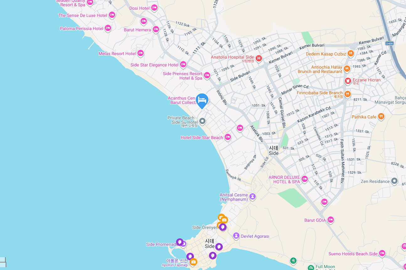 튀르키예 시데에 위치한 아칸투스 세네트 바루트 컬렉션 울트라 올 인클루시브 호텔은 자연과 역사, 휴식을 조화롭게 누릴 수 있는 최적의 입지를 자랑합니다. 이 호텔 주변은 아름다운 해변과 고대 유적지가 가까워 여행객들이 다양한 관광과 레저를 즐기기에 편리합니다.