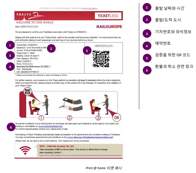 A. 온라인 구매를 한 후 열차 탑승 전, 편의에 따라 집에서 티켓을 출력하거나, 탈리스 열차 탑승 전 프랑스 내에 있는 기차역의 자동 발매기에서 발권할 수 있습니다. 자동 발매기에서 티켓 수령은 프랑스 내에서만 가능합니다.