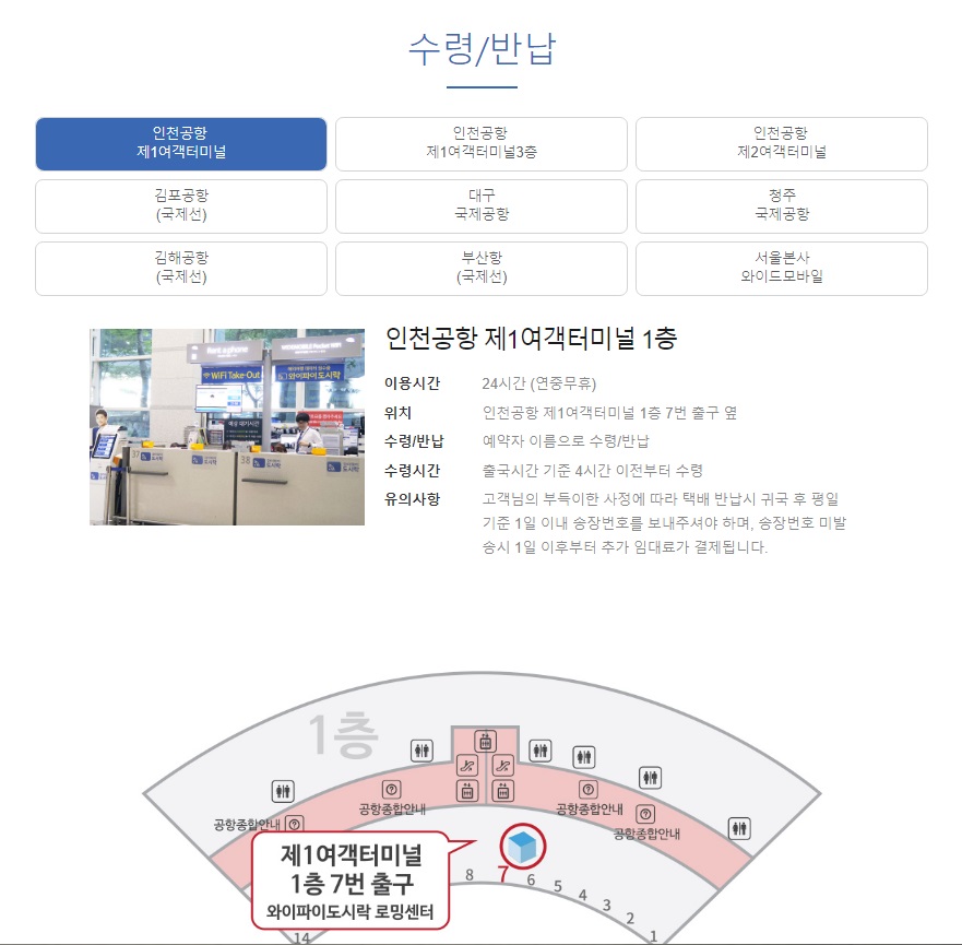 와이파이단말기는 예약신청하시면 인천공항1여객터미널, 2여객터미널,