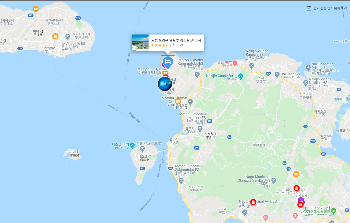 츄라우미수족관 바로 옆이고 츄라우미수족관을 끼고았는 해양박공원과 산책로로 연결이 되어있어서 매우 편리했다. 조식도 만족했고 무엇보다 에메럴드비치를 도보로 5분내에 갈수있어서 좋았다. 아들과 엄마만 온 여행이라서 온천을 하지 못한것이 아쉽고 감기에 걸린탓에 실외수영장을 아뇽하지 못하고 오게되너 아쉽다. 호텔 객실 바닥이 말 로 되어있어서 좋았고 오션뷰가 환상적이었다. 다만 주변에 식당이 별루 없고 문을 일찍닫아서 위치에서 별 하나를 뺐다. 에메럴드비치에서 유유자적 쉬고싶고 수족관과 공원에서 쉬고싶은 가족들에게 추천합니다.