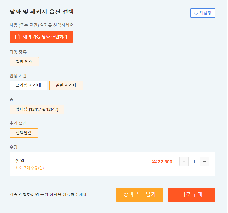 부르즈 할리파 입장권에 추가할 수 있는 다양한 추가 옵션을 선택하면