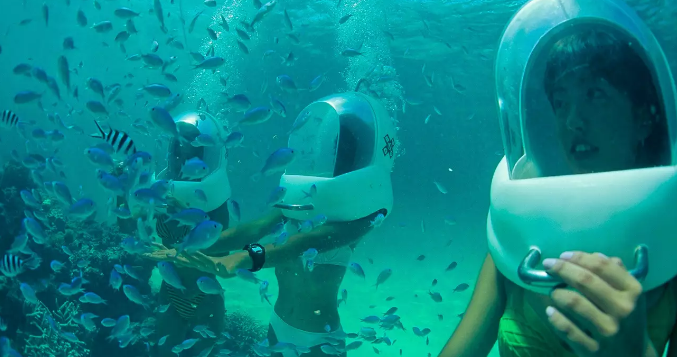 특수 제작된 다이빙 헬멧을 쓰고 편안하게 투어를 즐겨보세요.