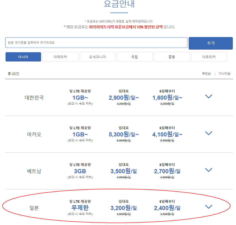 일본 통신사망을 이용하는 와이파이 도시락의 가격은 10% 할인 받으시면