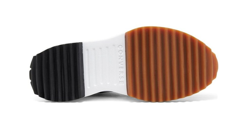 검은 색 줄무늬가 있고 힐에 로고가 있는 탑 폼 고무 밑창은 갈색과