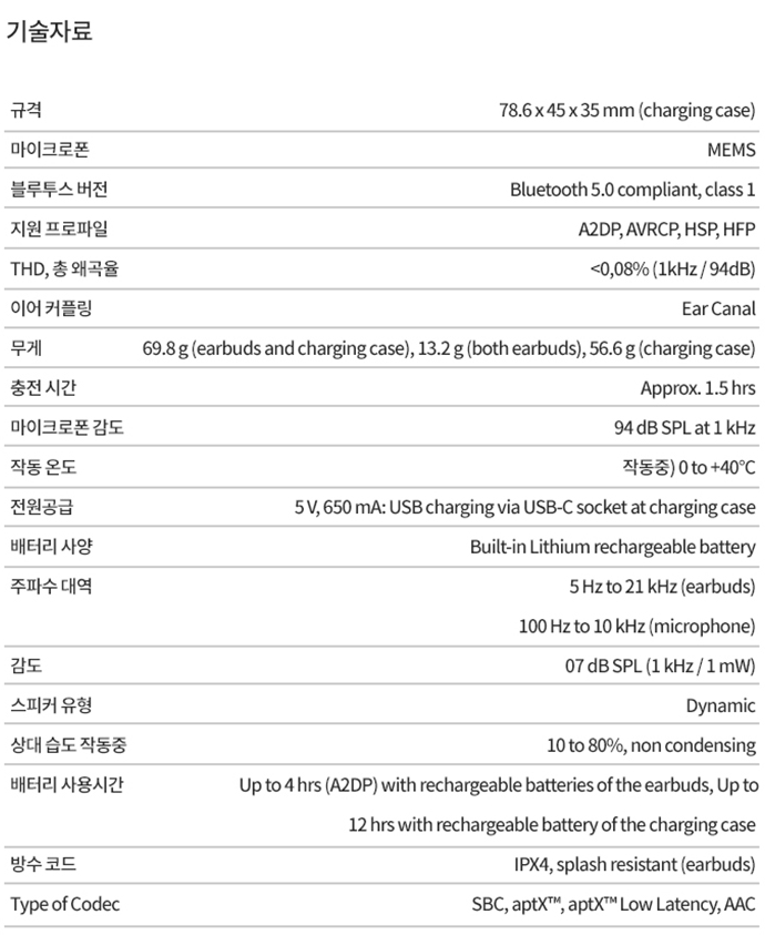 언제봐도 세련된 디자인 깔끔한 디자인의 작은 이어버드는 정교한 디테일로 우수한 성능과 완벽한 조합을 자랑합니다. 프리미엄 블랙 하우징, 매끈한 메탈 스핀 링과 금도금 된 충전 핀은 영원히 사랑받는 디자인을 완성합니다. 작고 편리한 충전 케이스로 이어버드를 2번 완전충전 함으로써 총 12시간의 사용시간을 확보할 수 있습니다.