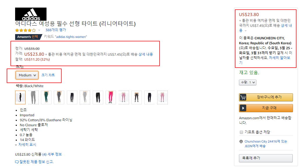 아디다스직구// 아디다스 레깅스 29.99달러 + 배송비 6.45달러 아마존 한국직배송 따라하기