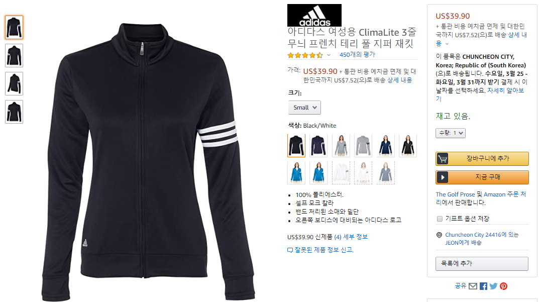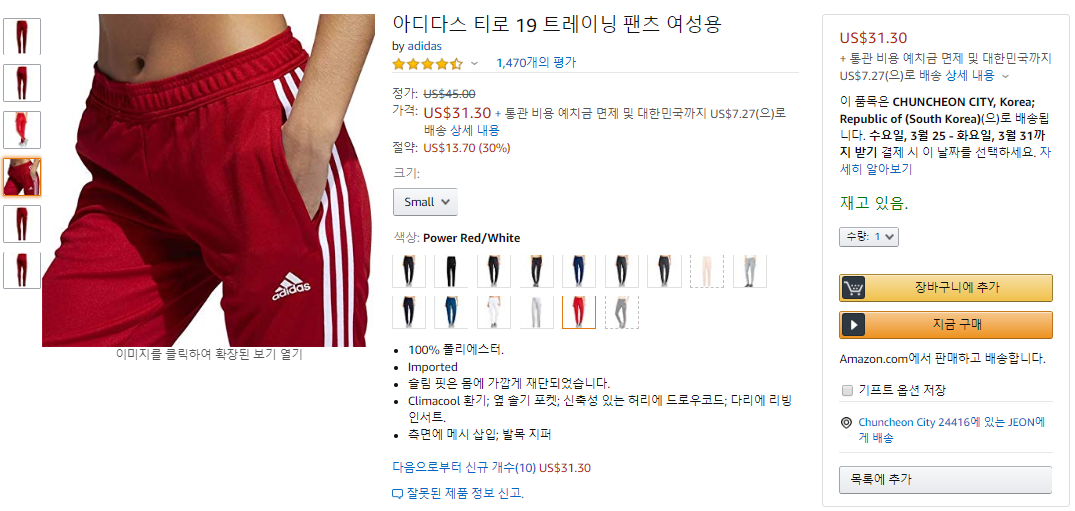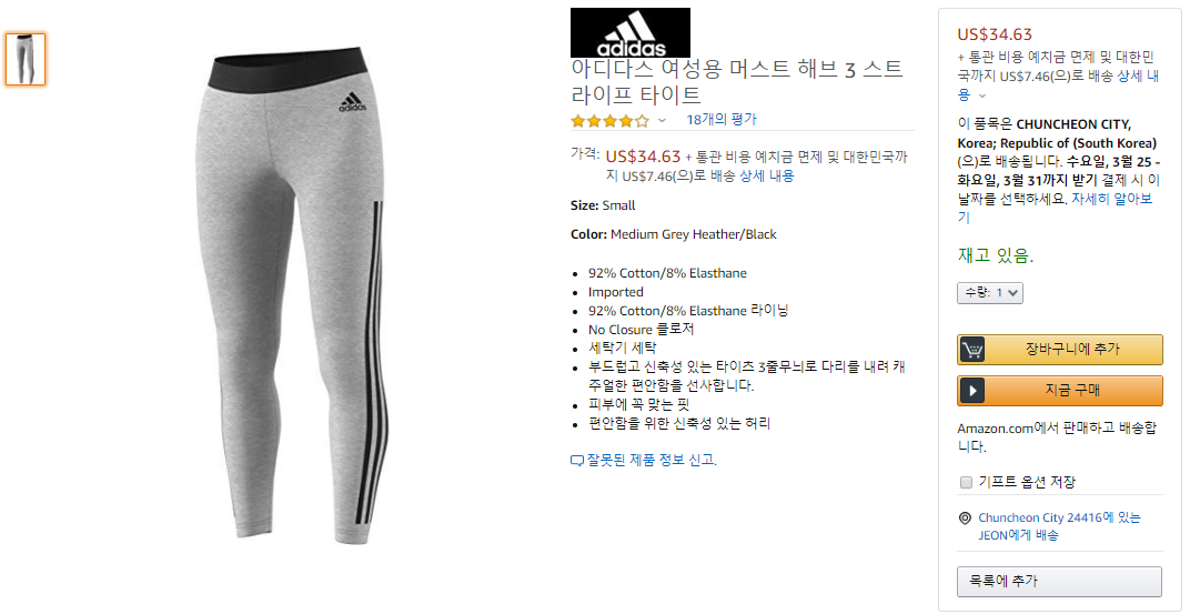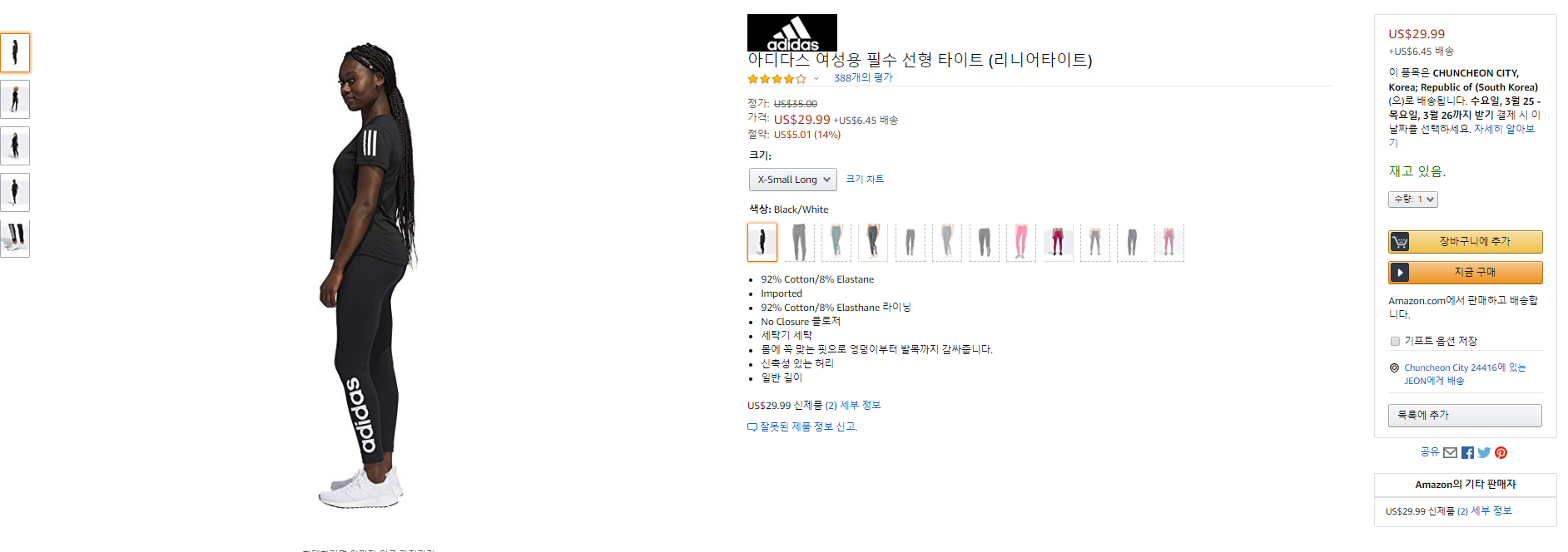 아디다스 레깅스 아마존 직구가 29.99달러에 한국으로 직배송가능한