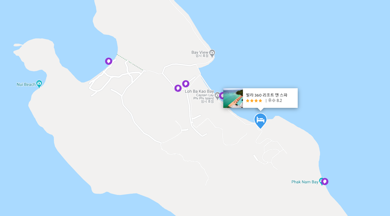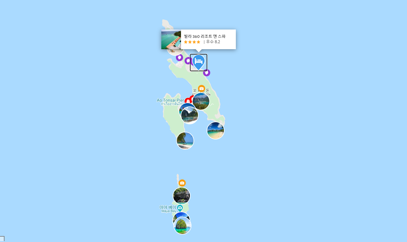 피피섬 선착장에서 꼬리배를 타고 한번더 이동을 해야함. 원래 안그렇다는데 그날은 바람이 많이 불어서 꼬리배 타고 있던 몸이 바닷물에 전부 젖었어요 머리까지 홀딱. 전부. 앞에 두었던 짐들도 다 젖음. (근데 이런거 좋아해서 기분 좋았음) 1박 했는데 최소 2박은 해야 만족도가 오를꺼같음. 아쉬웠음. 수영장 예쁘고 여유즐기기에 좋음. 조식은 보통. 분위기에 취해서 더 맛있게 느껴지기도 함. 뷰는 진짜 끝내주고. 바다에서 숙소를 바라봤을때 오른쪽으로 비치 따라 끝까지 가면 (한..10분?) 리조트가 줄지어 있다가 왼쪽으로 들어가는 골목이 나옴. 그냥 시멘트 길이라 첨엔 이길이 맞나 싶지만 그길로 들어가보시길. 분위기 끝내주는 마을이 나옴. 밤에 가야 멋있음. 동화속 마을. 거기서 술한잔하고 숙소로 들어갔는데. 밤늦게 가시는 분들 참고하길. 저녁엔 모래비치였던 바다가 바닷물로 가득참. 비치따라 가지말고 바로 붙어있는 다른 리조트 길로 가야함. 어차피 비치나 리조트 길이나 사실 그게 그거임. 빌라 360을 눈앞에 둔 위치에선 뒷길로 담넘어 들어갔네요. 물이 차서 빌라 360 앞쪽으로 갈수가 없었음. 거기 경비원이 있음 (옆리조트경비원임. 길안내 도와줘서 팁 드림) 늦게 마을에 가시는 분들은 꼭 참고 하시길. 그래도 그 마을을 즐기려면 저녁에 가야함. 그리고 숙소는 벌레도 없고. 룸컨디션 좋고. 조용함. 만족. 아! 직원 친절함. 숙소에서 운영하는 스노쿨링 상품 이용하면 스노쿨링 장비 빌려주는데 오리발은 사이즈가 많지 않았음.