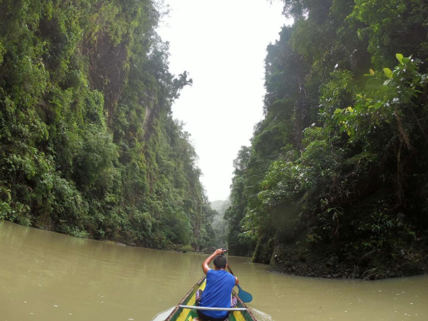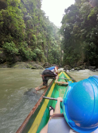 필리핀 전통 보트인 방카에 오라타 17km의 여정이 시작됩니다.
