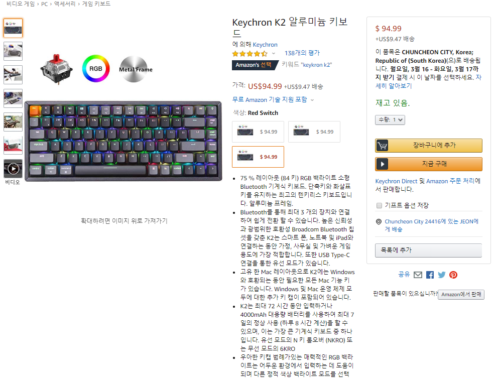 아마존 직구로 만날 수 있는 Bluetooth 기계식 키보드 Keychron K2 알루미늄 키보드는