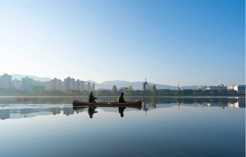 태양과 마주하는 시간을 가집니다. 춘천에서 진행하는 카누 체험 중
