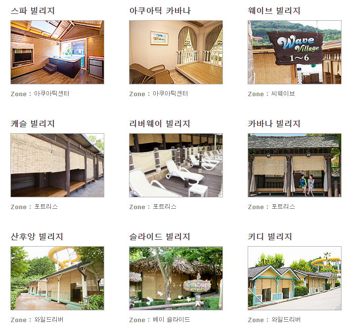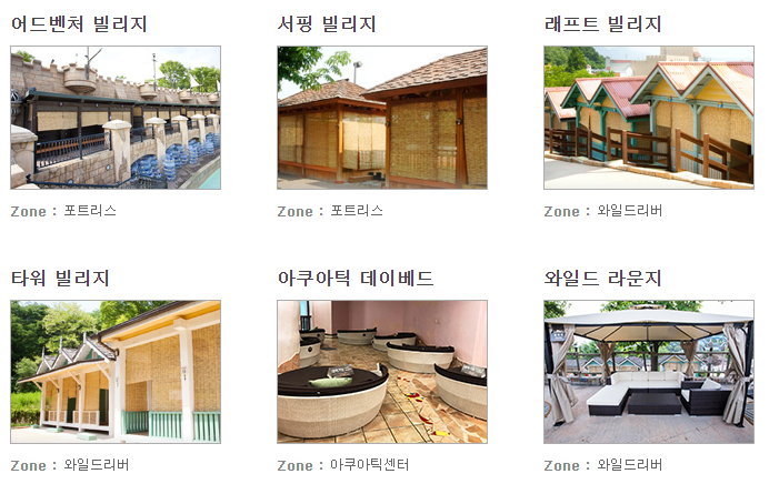 방갈로형 휴식 공간인 빌리지는 각 공간의 콘셉트에 맞게 다양한 테마로 구성되어 있습니다.