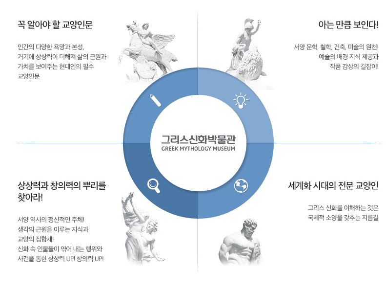 제주도가족여행에 아이들과 함께 체험하기 좋은 전시관 제주도 그리스 신화 박물관은 상상력과 창의력의 뿌리, 3000년 역사의 지혜이자 현대인의 필수 교양인문인 그리스신화가 살아 숨쉬는 곳으로‘세계최초’ 제주에서 만나는 신개념의 그리스신화박물관으로 루브르, 바티칸 박물관 명화와 대리석 조각상으로 200여점이 재현되어 있습니다.