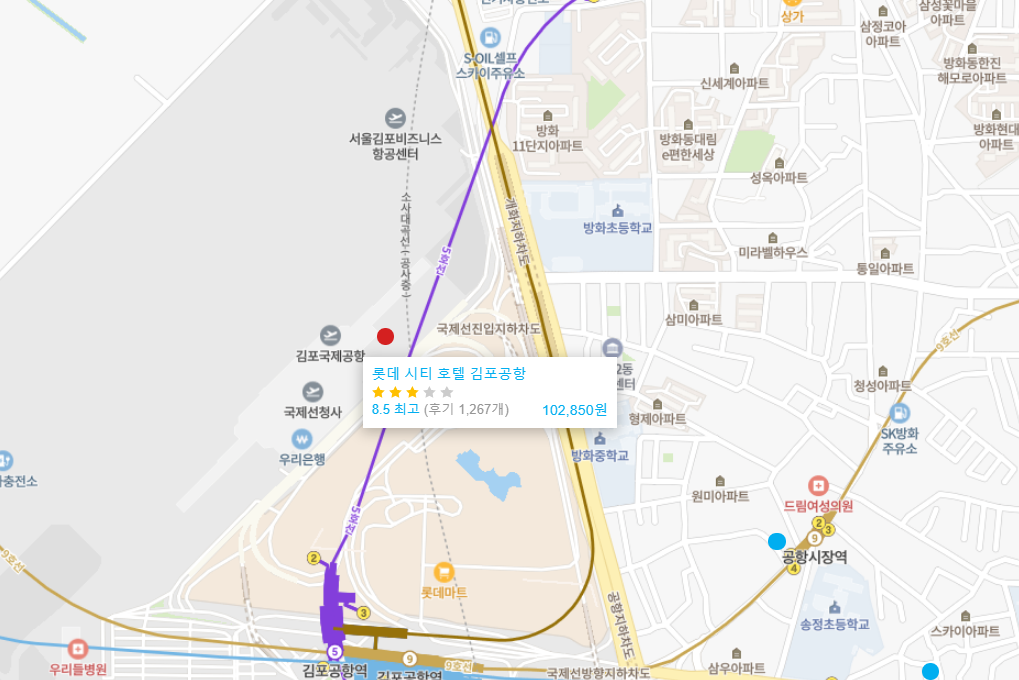 롯데 시티 호텔 김포공항은 지하철 5, 9호선, 공항철도 김포공항역에서 지하 연결통로를 통해 걸어서 5분이면 도착하는 편리한 위치를 자랑합니다. 또한, 이 통로를 통해 김포 국제공항까지 걸어서 10분이면 도착합니다.