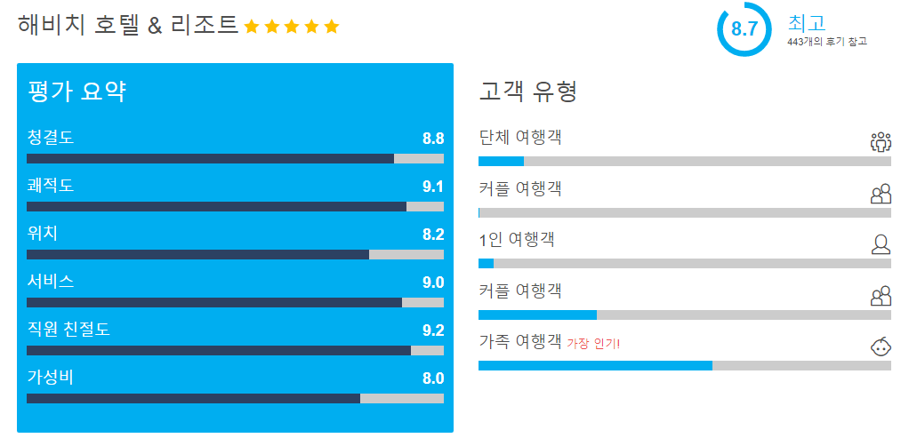 리조트였지만 호텔못지않게 깨끗하고 친절하시구 넘좋았는데 아쉬운게 있었다면 전자레인지가 없더라구요~년말에 동생네 가족이랑 한번더 가려구요~