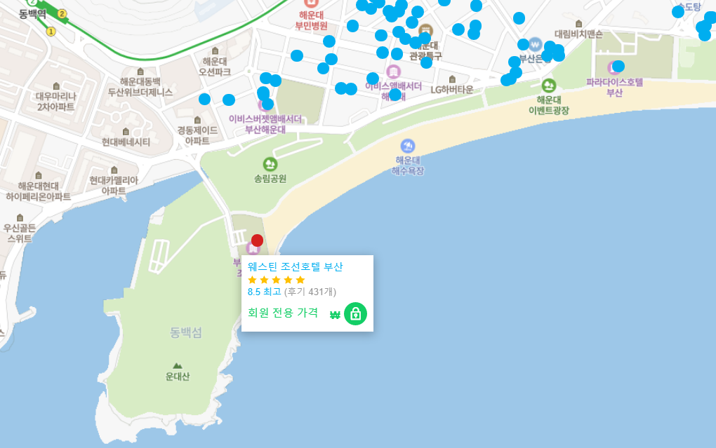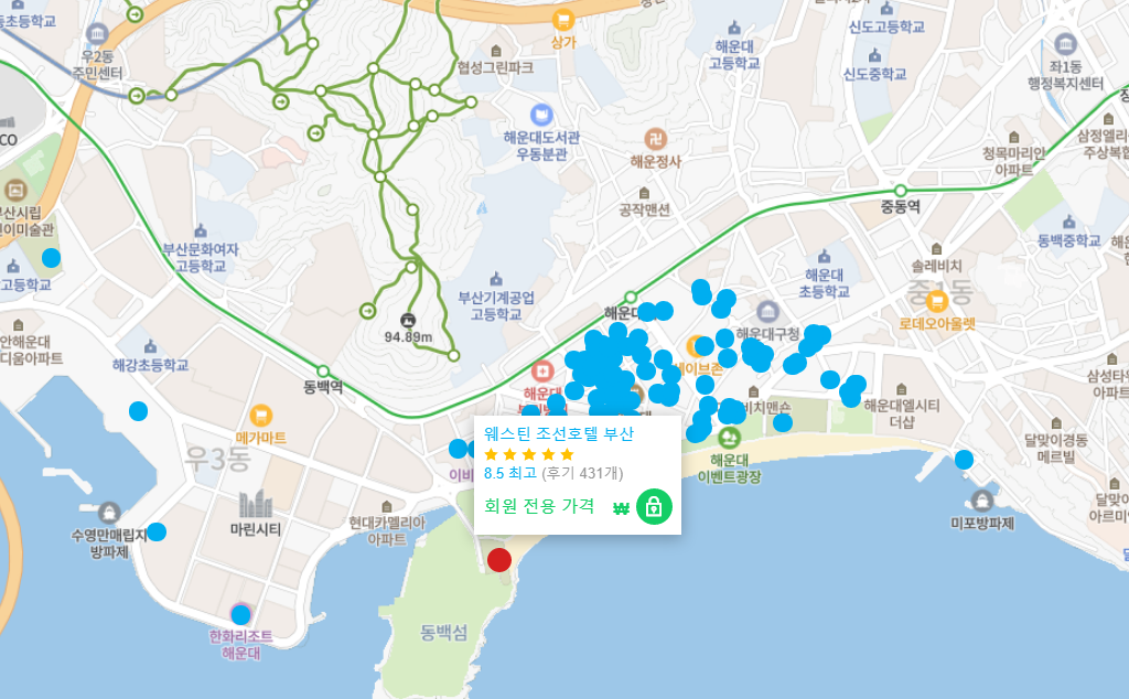 해운대 해수욕장 바로 앞에 있는 웨스틴 조선호텔 부산 (The Westin Chosun Busan)은 부산 2호선 동백역 1번 출구에서 도보로 약 10분 거리에 있습니다. 걸어서 약 10분이면 누리마루 APEC 하우스와 SEA LIFE 부산 아쿠아리움을 갈 수 있습니다.. 지하철로 두 정거장 거리에는 벡스코, 신세계 백화점 센텀시티점, 롯데 백화점 센텀시티점 등이 있으며 약 20분 소요됩니다.