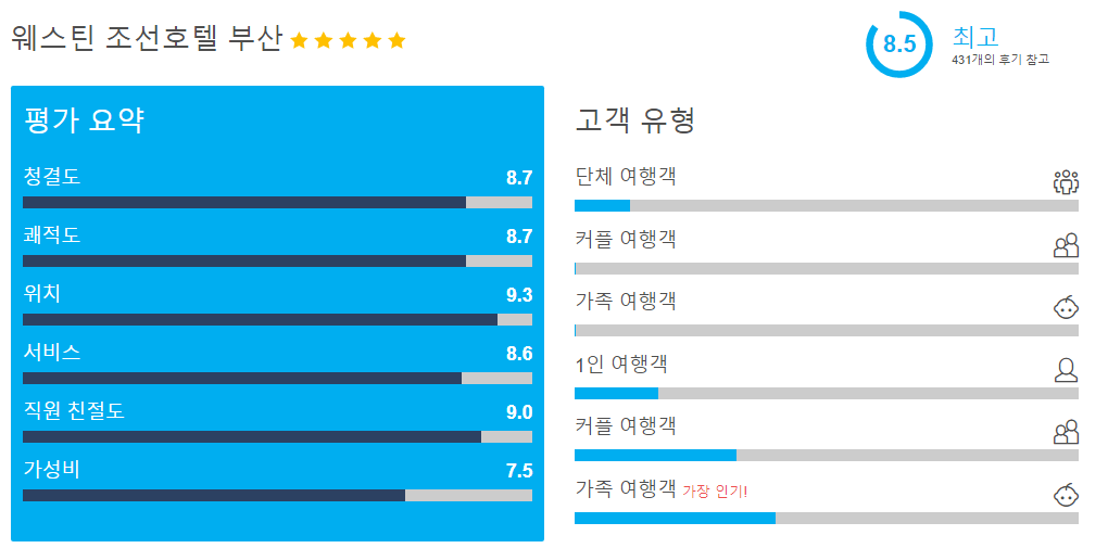 웨스틴 조선호텔 부산 (The Westin Chosun Busan)의 객실타입, 호텔옵션에 따라 현재 10만원대부터 다양하게 확인하실 수 있습니다. 호텔스 컴바인 사이트를 이용하시면 호텔예약사이트들의 가격 및 호텔옵션을 비교하여 쉽게 최저가를 확인하실 수 있습니다.