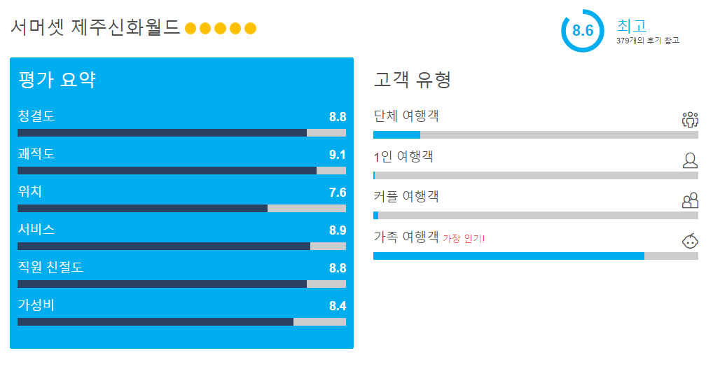 청결도 : 5점 (지어진지 얼마되지 않아 깔끔) 서비스 및 친절 : 5점 (신화월드의 최고 서비스) 위치 및 부대시설 5점 (주변에 다이소도 있음) 지어진지 얼마 되지 않았기에 건물 자체가 엄청 깔끔하고 서머셋의 경우 방3개 화장실2개 부엌까지 구비되어 있어 가족여행객에게는 아주 최고 적합한 숙소였습니다. 밖에서 들리는 새소리와, 너무나도 예쁜 풍경들로 제주를 만끽하고 왔네요~ 힐링 그 자체입니다. 많은 숙소 찾아보다 선택한건데 다들 모두 만족하고 감동했습니다.^^ 다음에 또 재방문하겠습니다.