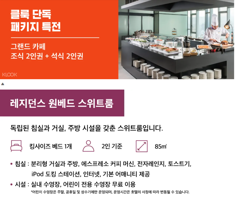 서울에서 가까워 서울호캉스호텔을 찾으시는 분들에게 안성맞춤인 5성급의 호텔로 단독 최대 58% 할인 호캉스 패키지로 레지던스 원베드 스위트룸에 2인조식과 2인 석식이 포함되어 있으며, 실내수영장, 어린이 수영장도 이용하실 수 있습니다.