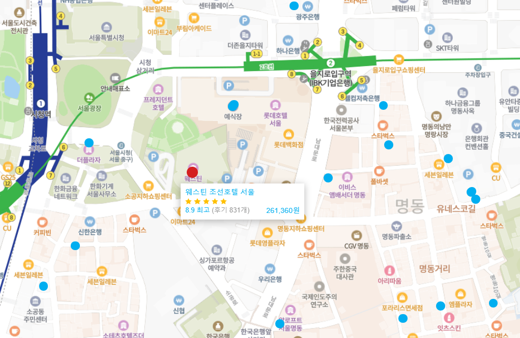 웨스틴 조선호텔 서울 (The Westin Chosun Seoul)은 1, 2호선 시청역 6번 출구에서 4분 거리에 위치해 있습니다. 이 호텔은 롯데백화점 소공점 바로 뒤에 있고, 걸어서 5분이면 명동까지 가실 수 있습니다. 또한 도보 7분 거리에 남대문 시장, 청계천도 위치해 있습니다. 차로 15분이면 서울N타워도 가실 수 있습니다.