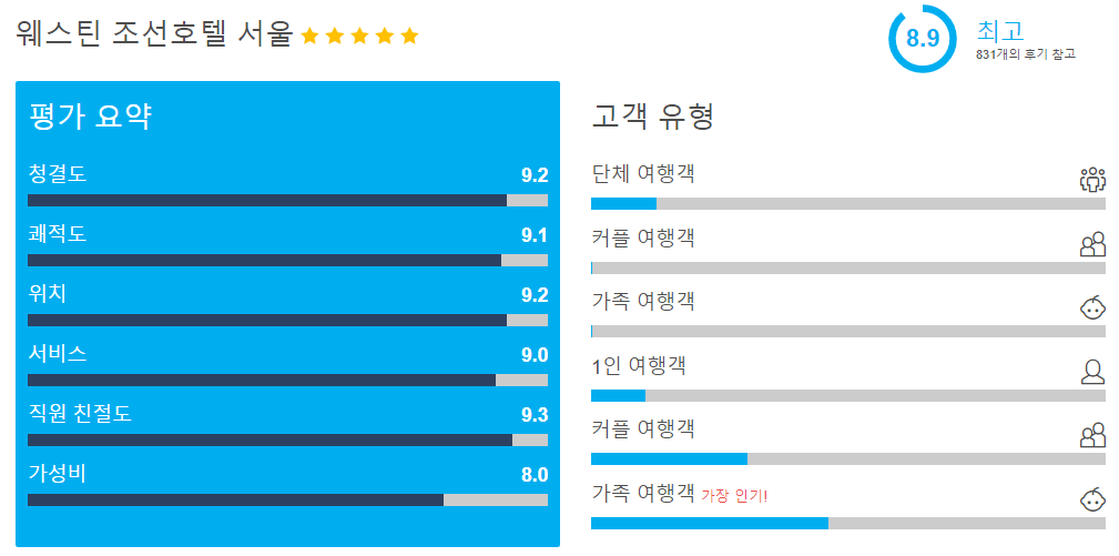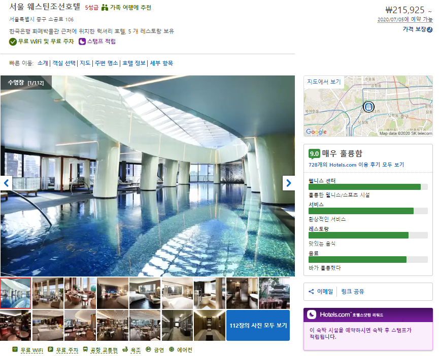 웨스틴 조선호텔 서울 (The Westin Chosun Seoul)은 객실타입, 호텔옵션에 따라 현재 10만원대부터 다양하게 확인하실 수 있습니다. 호텔스 컴바인 사이트를 이용하시면 호텔예약사이트들의 가격 및 호텔옵션을 비교하여 쉽게 최저가를 확인하실 수 있습니다.
