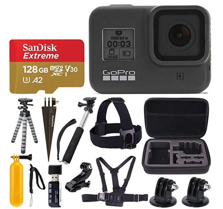 SanDisk 128GB 익스트림 메모리 카드, 하드 케이스, 그립스터 유연한 삼각대, 헤드 스트랩 마운트, J-후크, 핸드헬드 모노포드, SD 카드 리더기, 삼각대 마운트, 스파이크 마운트, 플로팅 핸들, 가슴 트랩 마운트.