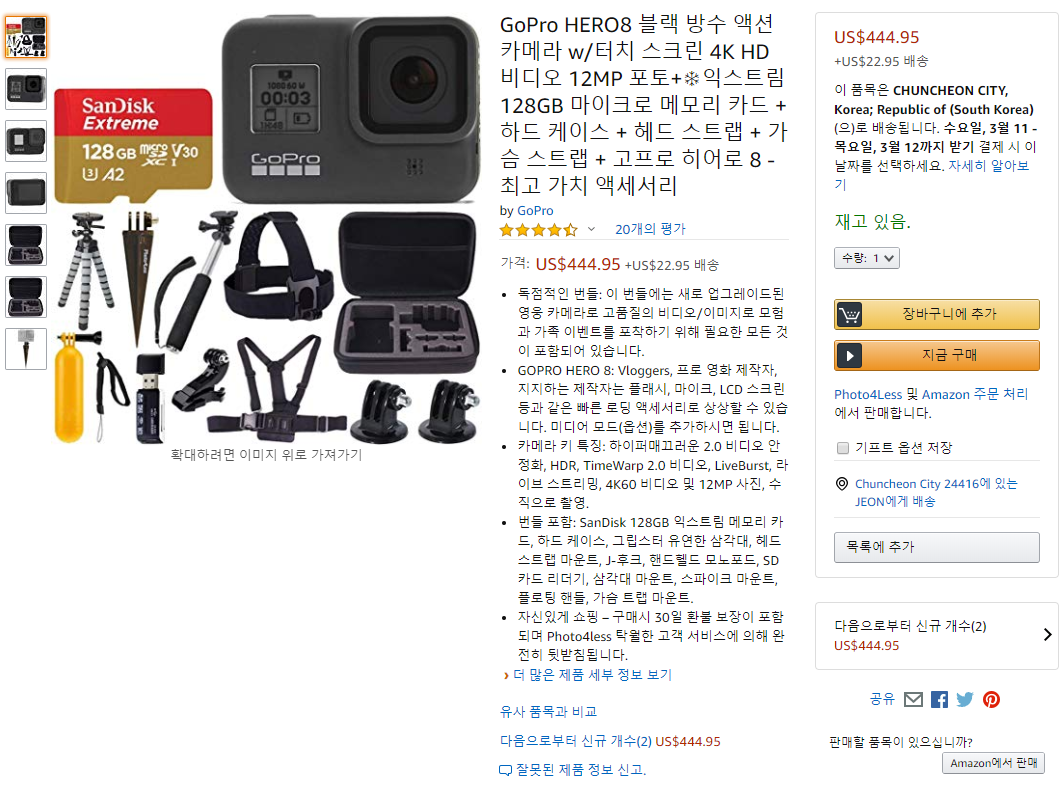 액션카메라 직구// 고프로액션카메라 최신시리즈 고프로히어로 8 액션카메라 방수풀패키지세트 (GoPro HERO8)