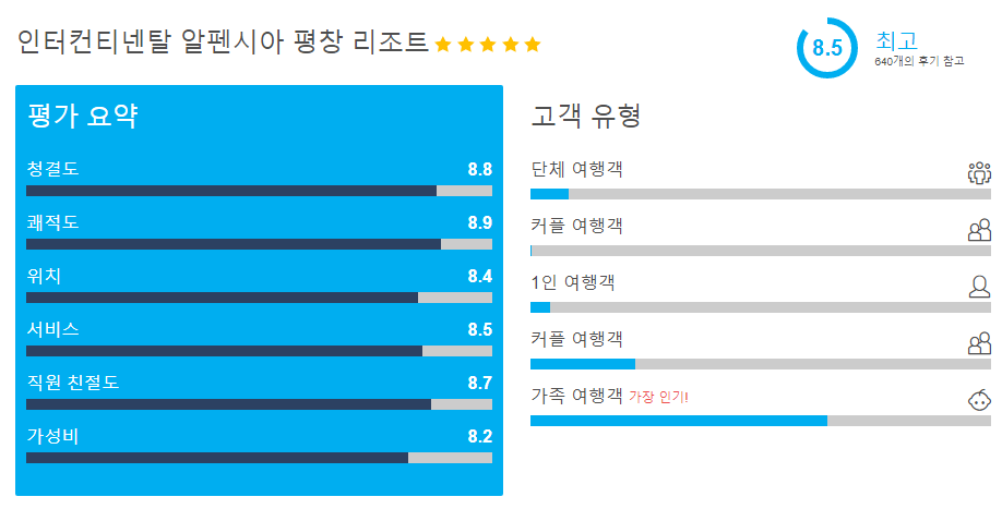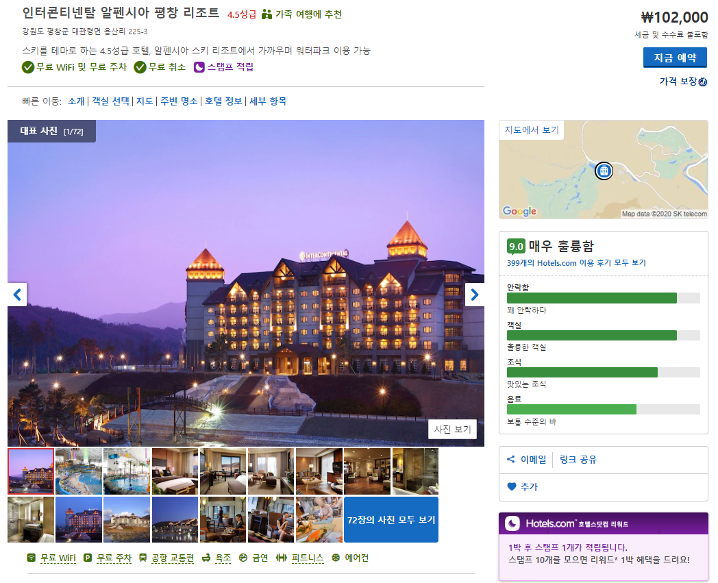 인터컨티넨탈 알펜시아 평창 리조트 (Intercontinental Alpensia Pyeongchang Resort)는 객실타입, 호텔옵션에 따라 현재 10만원대부터 다양하게 확인하실 수 있습니다. 호텔스 컴바인 사이트를 이용하시면 호텔예약사이트들의 가격 및 호텔옵션을 비교하여 쉽게 최저가를 확인하실 수 있습니다.