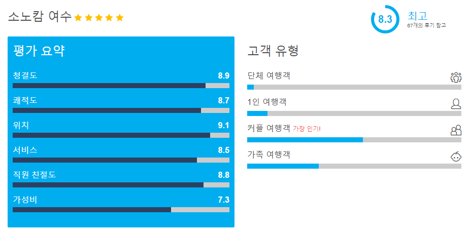 소노캄 여수호텔은 객실타입, 호텔옵션에 따라 현재 10만원대부터 다양하게 확인하실 수 있습니다. 호텔스 컴바인 사이트를 이용하시면 호텔예약사이트들의 가격 및 호텔옵션을 비교하여 쉽게 최저가를 확인하실 수 있습니다.