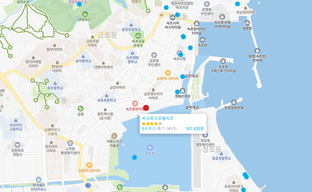 속초 청학동에 위치한 씨크루즈호텔속초 (SeaCruise Hotel)는 동해바다와 설악산을 포함한 강원도의 주요 명소로의 이동이 용이한 호텔입니다. 호텔에서 10분 정도 걸으시면 속초 중앙시장과 청초호 호수공원에 가실 수 있고 차로 약 10분을 가시면 속초엑스포월드랜드도 둘러보실 수 있습니다.
