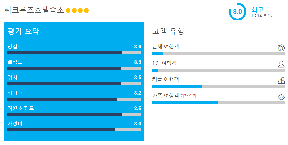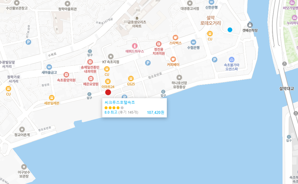 찾기 쉬운 숙소의 위치와 깨끗한 시설이 좋았구요. 객실에서 바라본 전망 역시 속초를 한눈에 담을 수 있어 좋았습니다. 다음에도 속초에 오면 또 오고 싶네요~