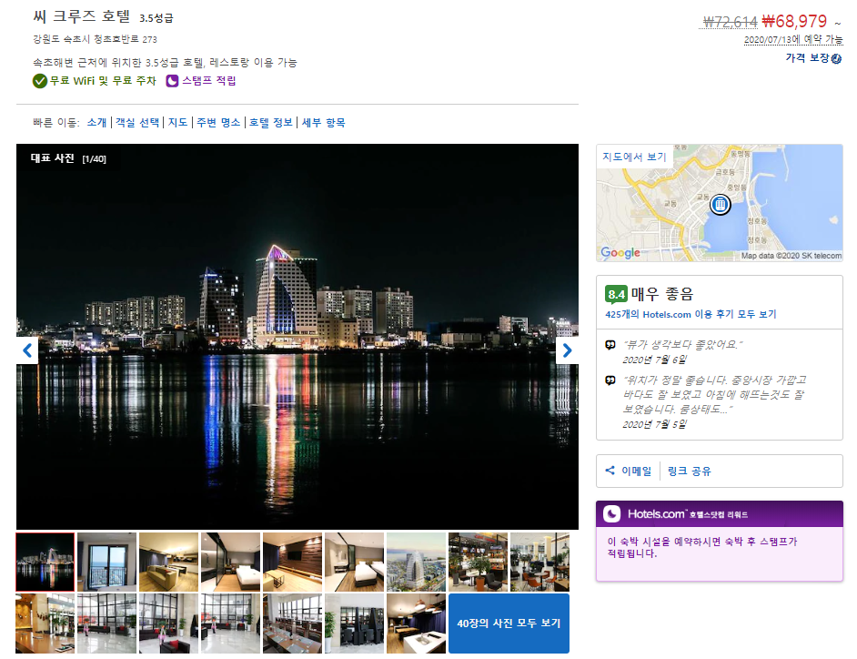속초 씨크루즈호텔 (SeaCruise Hotel)은 객실타입, 호텔옵션에 따라 현재 10만원대부터 다양하게 확인하실 수 있습니다. 호텔스 컴바인 사이트를 이용하시면 호텔예약사이트들의 가격 및 호텔옵션을 비교하여 쉽게 최저가를 확인하실 수 있습니다.