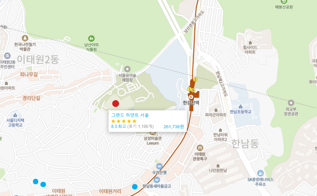 최고의 시설을 자랑하는 그랜드 하얏트 서울 (Grand Hyatt Seoul)은 지하철 6호선 이태원역 2번 출구에서 도보로 15분 거리에 자리하고 있습니다. 주변의 관광 명소로는 다양한 문화가 어우러진 이태원과 문화 공연을 감상할 수 있는 블루스퀘어가 도보로 약 15분 거리에 있으며 명동이 차로 10분 거리에 자리하고 있습니다.또한, 명동과 이태원으로 셔틀버스를 운행하고 있습니다.