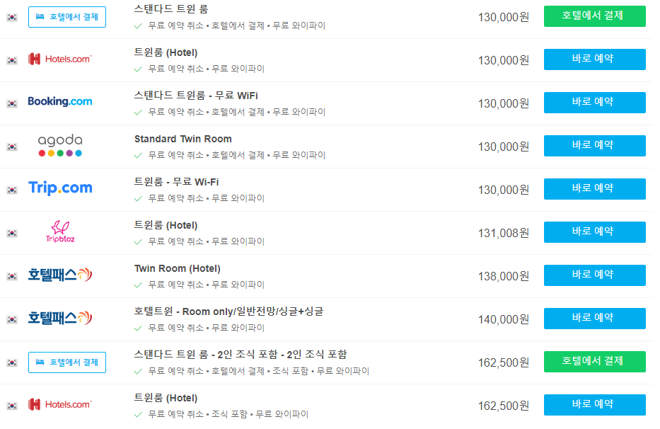 날짜에 따라서도 가격이 다르므로 여행날짜에 맞춰 가격을 검색하시는것이 좋습니다.