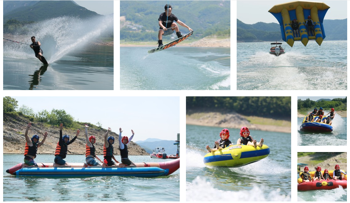제천수상레저 패키지는 바나나보트, 플라이피쉬, 땅콩보트, 빅마블, 밴드웨곤, 썸머윙 6가지 패키지를 즐기실 수 있으며 넓은 무료 주차장이 준비되어 있어 편리합니다.