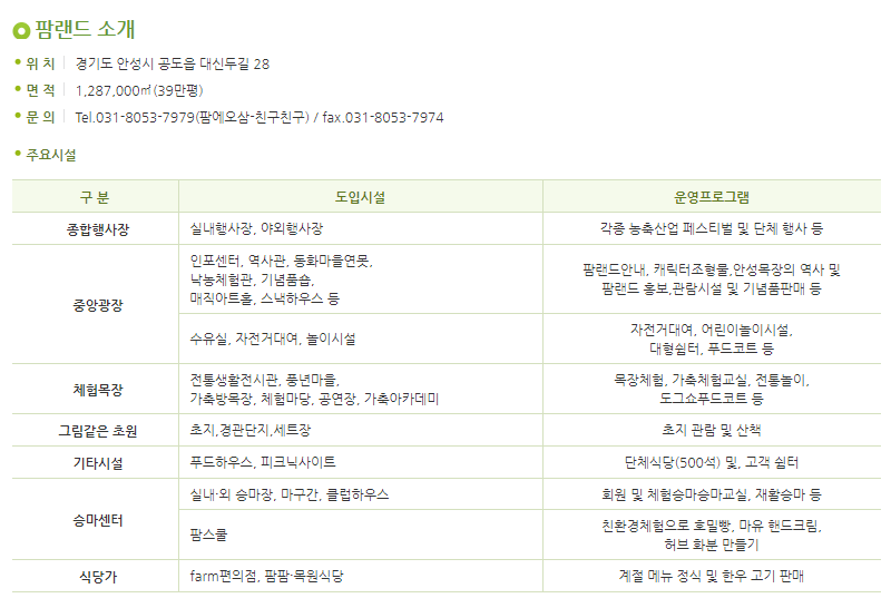팜랜드는 메인테마를 가축과의 즐거운 체험으로 설정하고 목장의 주요 인프라인 가축과 초지, 축사에 스토리를 더해 목장에 체험과 관광·서비스가 부가된 관광·휴양단지로 새롭게 변신하였습니다. 발상의 전환을 통해 기르는 농·축산업을 보고 즐기는 농·축산업으로 전환한 것입니다. "즐거운 체험목장" 안성팜랜드는 자라나는 어린이에게 다양한 감성 학습체험 공간입니다.