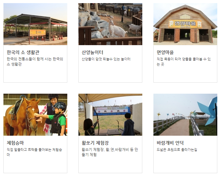 새모이체험관(유료) ▶ 가축체험장 ▶ 체험마당(유료) ▶ 풍년마을 ▶ 전통생활전시관 ▶ 토끼마을 ▶ 면양마을 ▶ 체험승마장(유료)