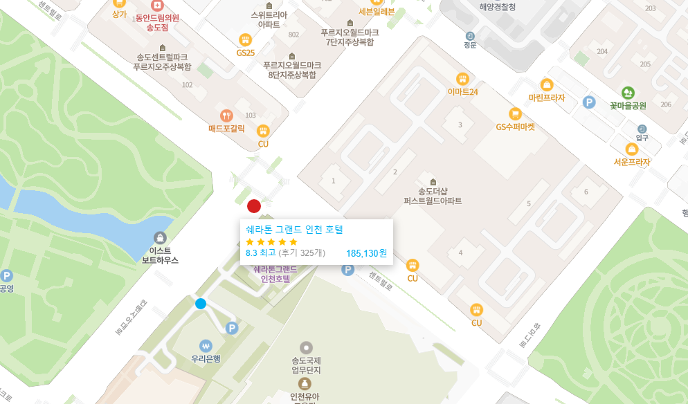 송도 컨벤시아 바로 옆에 자리한 쉐라톤 그랜드 인천 호텔 (Sheraton Grand Incheon Hotel)은 인천1호선 인천대입구역 4번 출구에서 도보 12분 거리에 있습니다. 주변 관광지로는 가까운 도보 거리에 송도 센트럴 파크가 있으며 쇼핑을 즐기기에 좋은 커낼워크는 1.5km 거리에 있습니다. 또한, 차로 25분 거리에 소래포구, 차로 40분 거리에 차이나 타운 등이 있습니다.