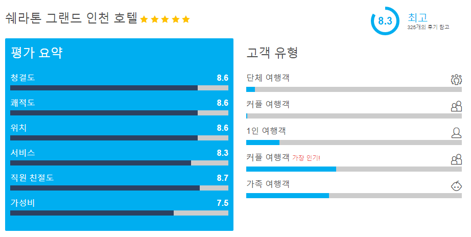 쉐라톤 그랜드 인천 호텔 (Sheraton Grand Incheon Hotel)은 객실타입, 호텔옵션에 따라 현재 10만원대부터 다양하게 확인하실 수 있습니다. 호텔스 컴바인 사이트를 이용하시면 호텔예약사이트들의 가격 및 호텔옵션을 비교하여 쉽게 최저가를 확인하실 수 있습니다.
