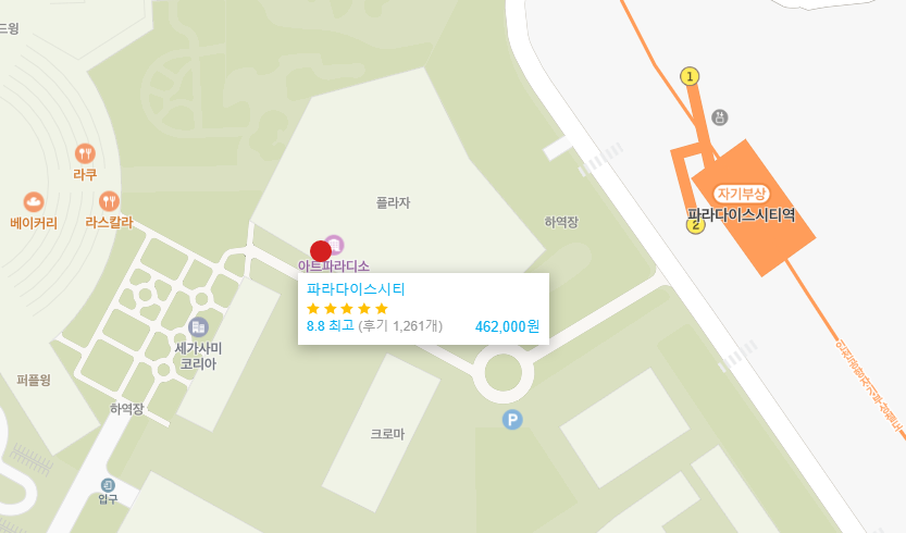 99,825평 규모의 부지에 위치한 복합 리조트인 파라다이스 호텔 앤 리조트, 파라다이스시티 (Paradise Hotel&Resort, Paradise City)는 카지노윙, MICE윙, 패밀리윙으로 구성되어 있습니다.