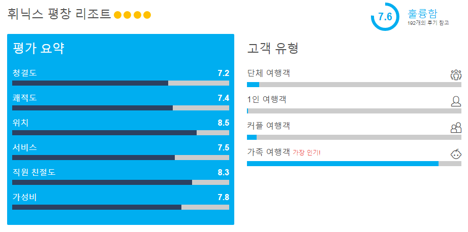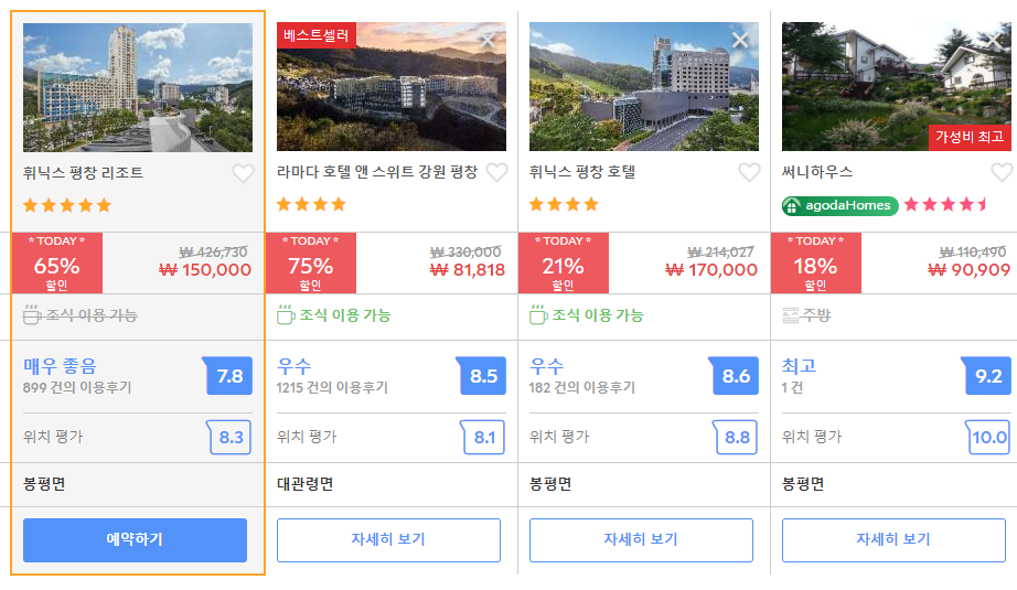 휘닉스 평창 리조트 (Phoenix Pyeongchang Resort)는 객실타입, 호텔옵션에 따라 현재 10만원대부터 다양하게 확인하실 수 있습니다. 호텔스 컴바인 사이트를 이용하시면 호텔예약사이트들의 가격 및 호텔옵션을 비교하여 쉽게 최저가를 확인하실 수 있습니다.