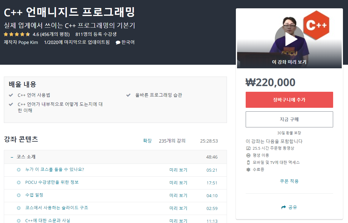 안녕하세요. C++ 프로그래밍 언어를 다시 복습하고자 수강했습니다. 여태 들었던 사설 프로그래밍 강의보다 가격, 퀄리티 모두 비교를 할 수가 없을 정도로 만족스럽습니다. 어느 국내 서적에서도 볼 수 없는 생생한 현업 실무 조언도 많이 들을 수 있었습니다. C++을 배우고자 하는 주변 분들께 추천하고 다니고 있습니다. :)
