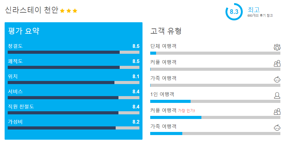 동생 생일이라서 갔는데 태풍에도 불구하고 시끄러운 소음 하나도 없었고 조식 너무 맛있었어요. 좁지만 공간은 알차게 잘 활용하게 썼구요. 침구도 누워있으면 사르르르 잠이 잘왔어요. 근데 에어컨이 개인적으로 온도를 조절할수없어서 잘때 더웠구요. 이불 안덮으면 또 추웠어요. 그런점이 조금 아쉽네요 ㅠ.ㅠ 하지만.....천안가면 또 이용할겁니다. ㅋㅋㅋㅋㅋ