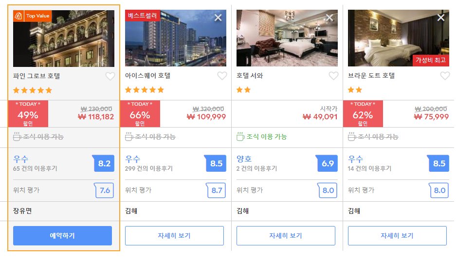 김해숙박 파인 그로브 호텔 (Pine Grove Hotel)은 객실타입, 호텔옵션에 따라 현재 10만원대부터 다양하게 확인하실 수 있습니다. 호텔스 컴바인 사이트를 이용하시면 호텔예약사이트들의 가격 및 호텔옵션을 비교하여 쉽게 최저가를 확인하실 수 있습니다.