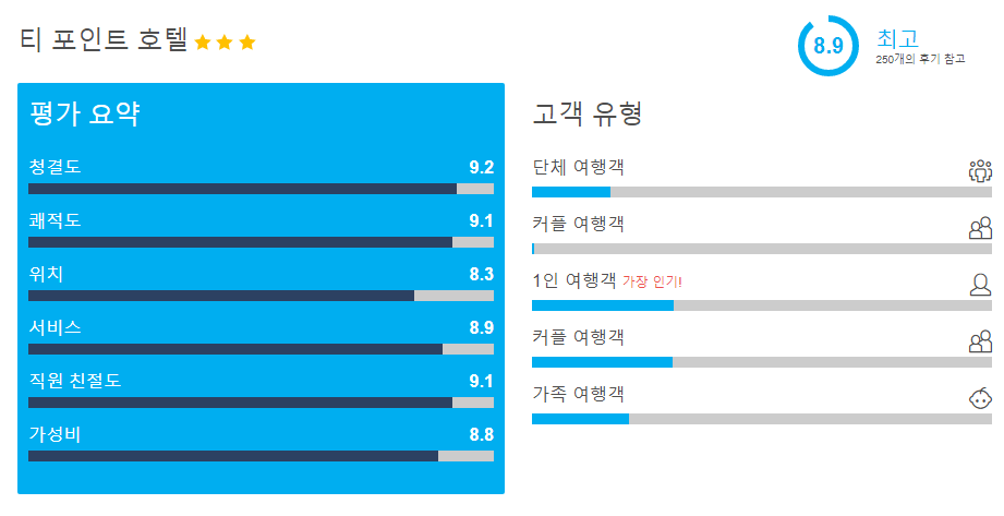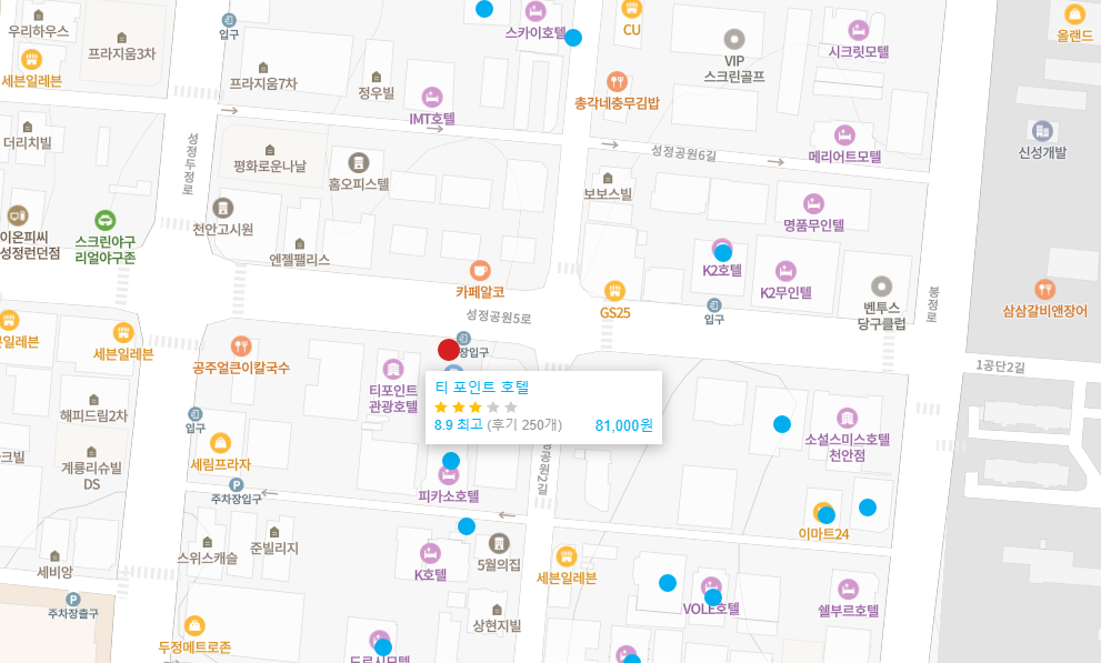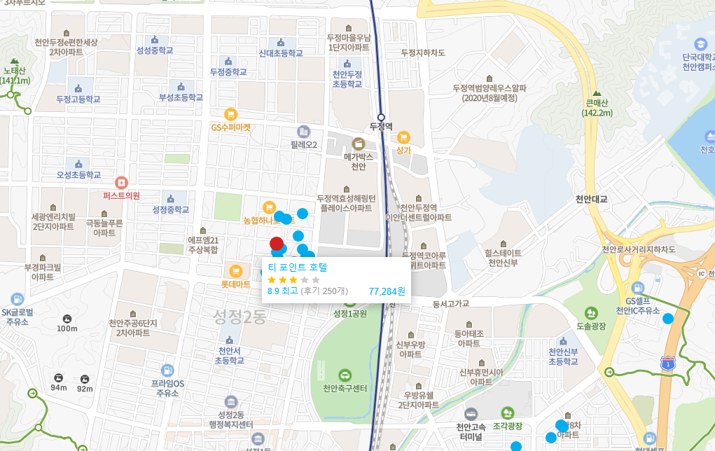 천안호텔 T 포인트 (Hotel T Point)는 객실타입, 호텔옵션에 따라 현재 10만원대부터 다양하게 확인하실 수 있습니다. 호텔스 컴바인 사이트를 이용하시면 호텔예약사이트들의 가격 및 호텔옵션을 비교하여 쉽게 최저가를 확인하실 수 있습니다.