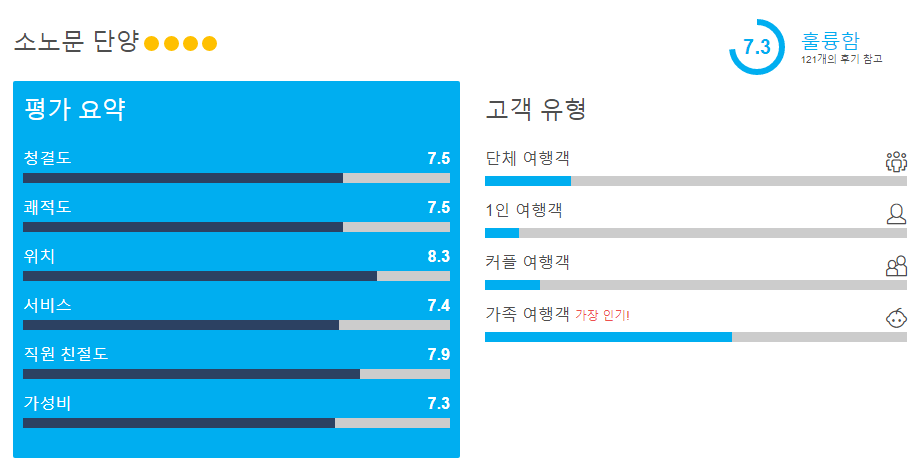 소노문 리조트 계열 중 단양은 처음 방문 했습니다. 대부분의 (구)대명리조트들이 그렇듯 여기도 객실 내 시설은 꽤 오래 된 편입니다. 다만 최대한 깨끗하게 잘 정리하려고 한 노력이 보입니다. 단양 스팟인 구경시장과 매우 가깝고, 남한강이 내려다 보이는 뷰는 매우 만족스럽습니다.
