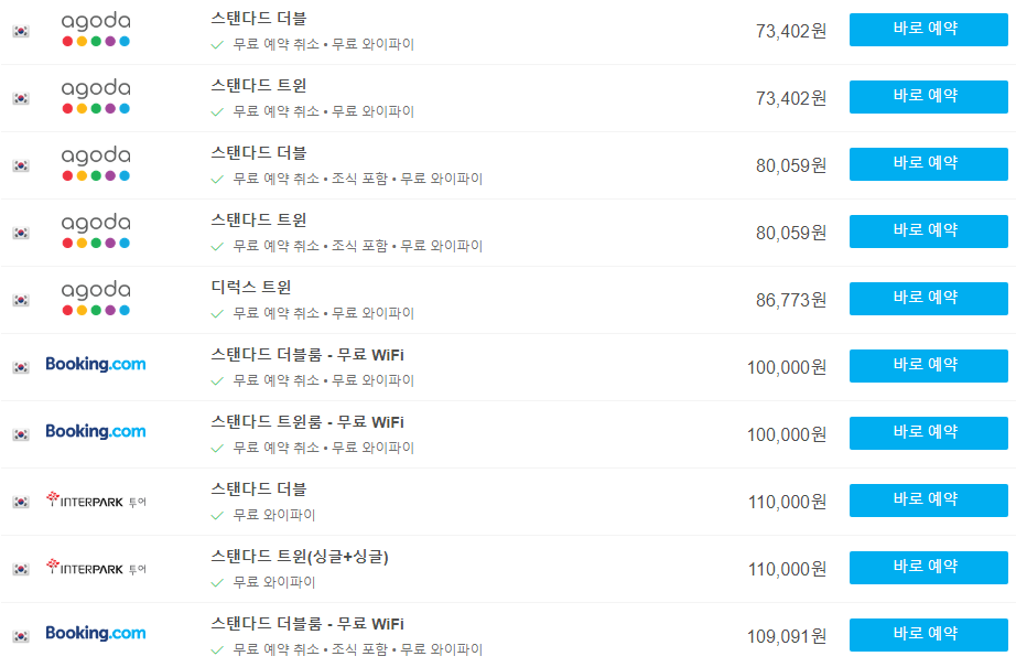 날짜에 따라서도 가격이 다르므로 여행날짜에 맞춰 가격을 검색하시는것이 좋습니다.