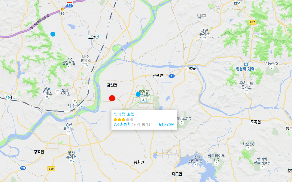 전라남도 나주여행에 숙박하기 좋은 위치와 깨끗한 나주호텔 빛가람 (Hotel Bitgaram)은 나주시외버스터미널에서 차로 10분 이내 거리에 위치해 있습니다. 주변 관광지로는 나주혁신도시의 야경을 즐길 수 있는 빛가람전망대가 차로 10분 거리에 있으며, 나주영상테마파크까지는 차로 약 30분이 소요됩니다.