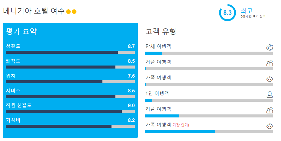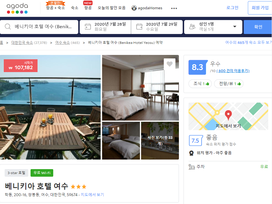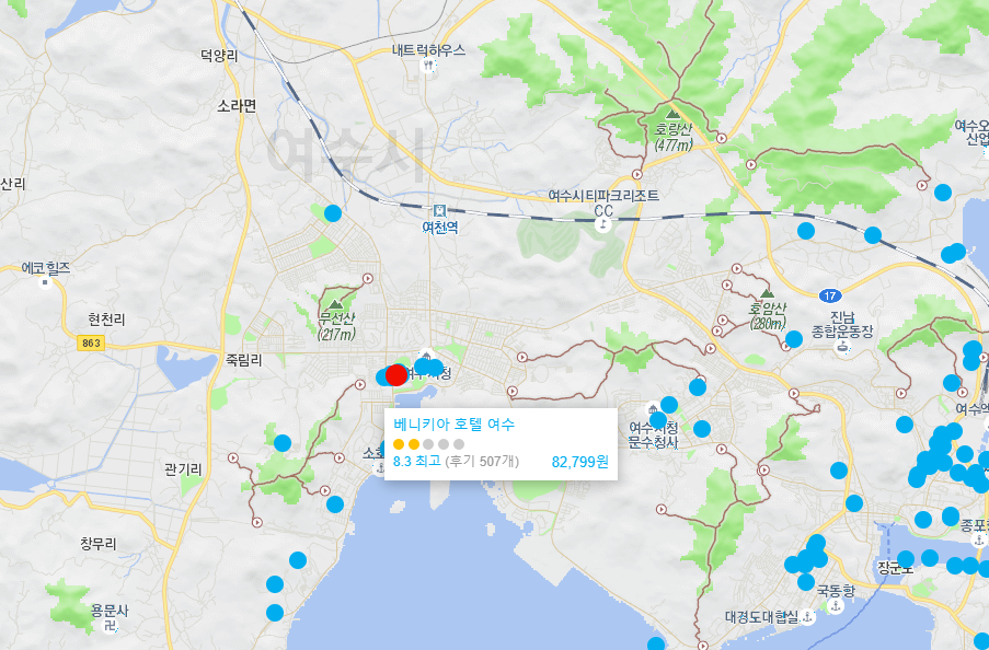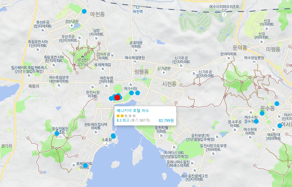 베니키아 호텔 여수 (Benikea Hotel Yeosu)는 객실타입, 호텔옵션에 따라 현재 10만원대부터 다양하게 확인하실 수 있습니다. 호텔스 컴바인 사이트를 이용하시면 호텔예약사이트들의 가격 및 호텔옵션을 비교하여 쉽게 최저가를 확인하실 수 있습니다.